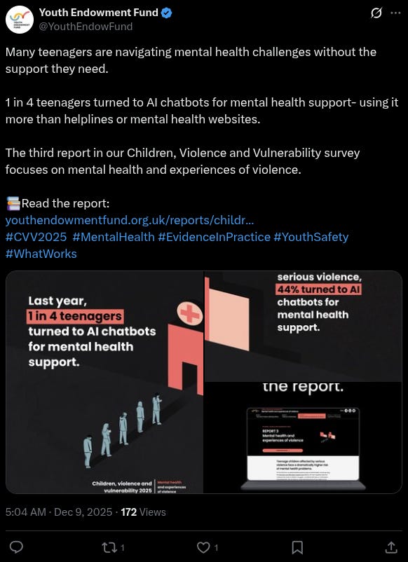 Victims or perpetrators of violence were even more likely to confide in these digital voids. As The Independent reported, “The YEF said AI chatbots could appeal to struggling young people who feel it is safer and easier to speak to an AI chatbot anonymously at any time of day rather than speaking to a professional.”