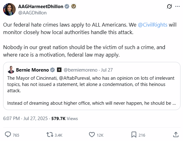 Back to the street attack incident, local media WXIX noted that Harmeet Dhillon, Assistant Attorney General for Civil Rights at the U.S. Department of Justice, was closely monitoring the investigation.