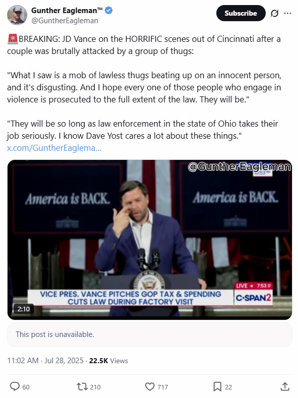 VP Vance also commented on the incident during an appearance in Ohio on Monday. He described the incident as a "street attack," and "What I saw is a mob of lawless thugs beating up on an innocent person, and it's disgusting."