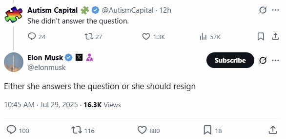 Musk commented on the video, saying, "Either she answers the question or she should resign."