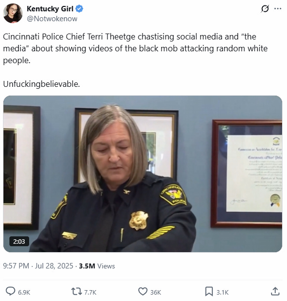 Cincinnati Police Chief Teresa Theetge told reporters on Monday that social media users and journalists are "missing context" by shining the spotlight on viral footage of a Black mob attacking White jazz festival partygoers in downtown Cincinnati, Ohio.