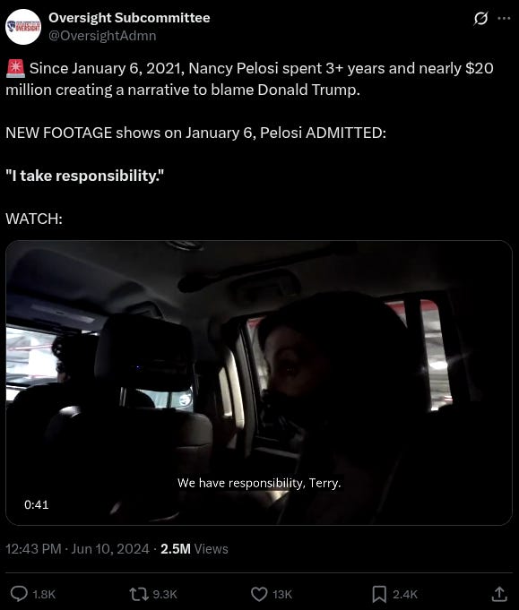 Footage was released in June 2024 from the House Oversight Committee of Nancy Pelosi taking responsibility for the January 6, 2021, protests and rioting at the US Capitol.