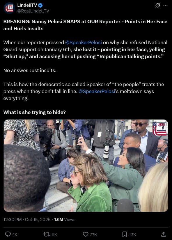 Yesterday, former Speaker Nancy Pelosi unloaded on Lindell TV reporter Alison Steinberg on the steps of the US Capitol after she was confronted on her deadly actions on January 6, 2021.