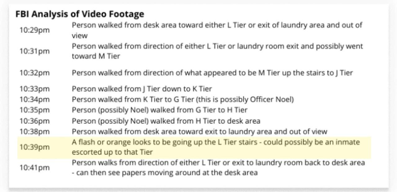 āAt approximately 10:39 p.m., an unidentified CO appeared to walk up the L Tier stairway, and then reappeared within view of the camera at 10:41 p.m.ā reads the entry.