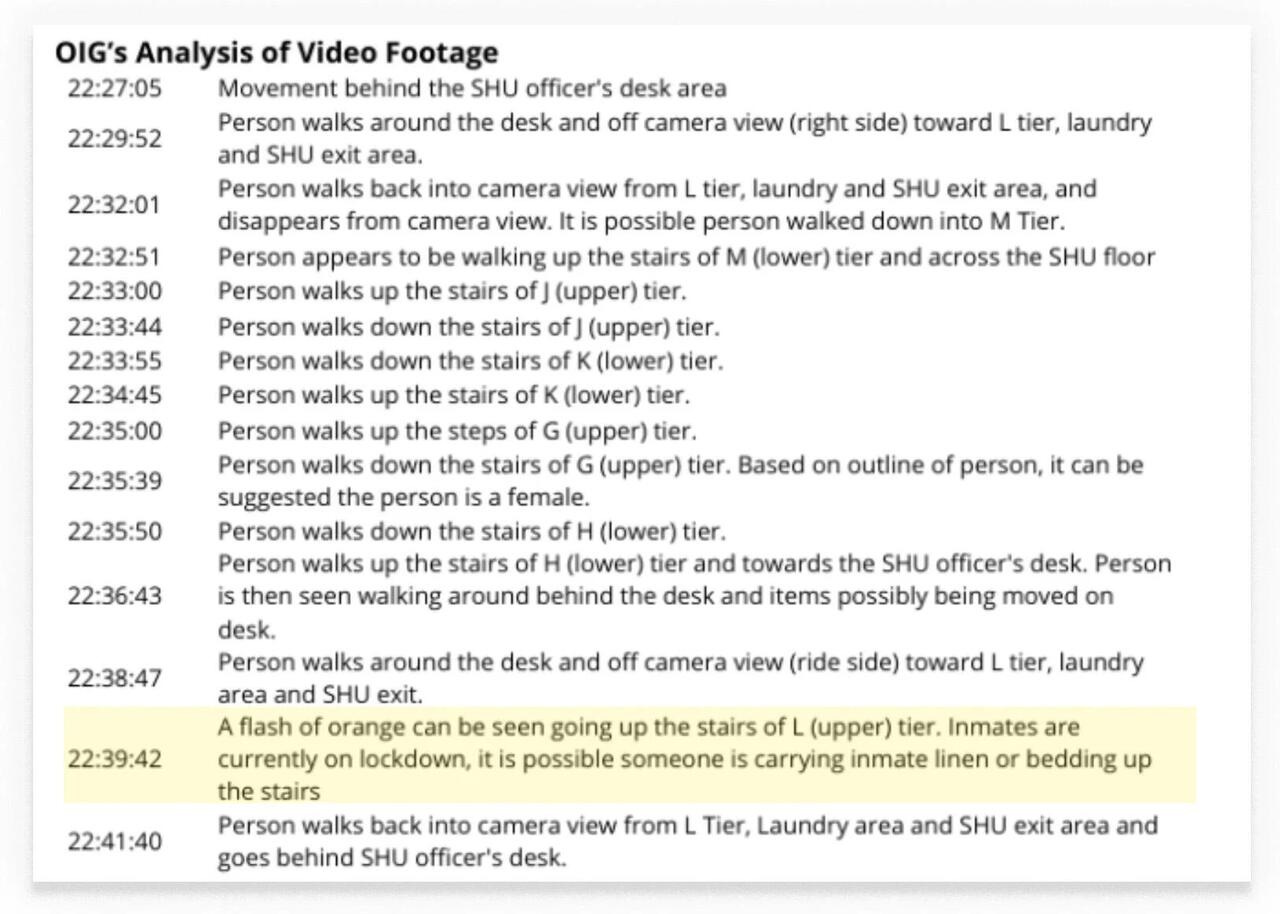 The observation was logged by the inspector general as an officer carrying orange ālinen or bedding,ā noting it in their final report as āan unidentified [corrections officer],ā despite the fact that the officers on duty said they didnāt replace any linens, as that was done during the previous shift.