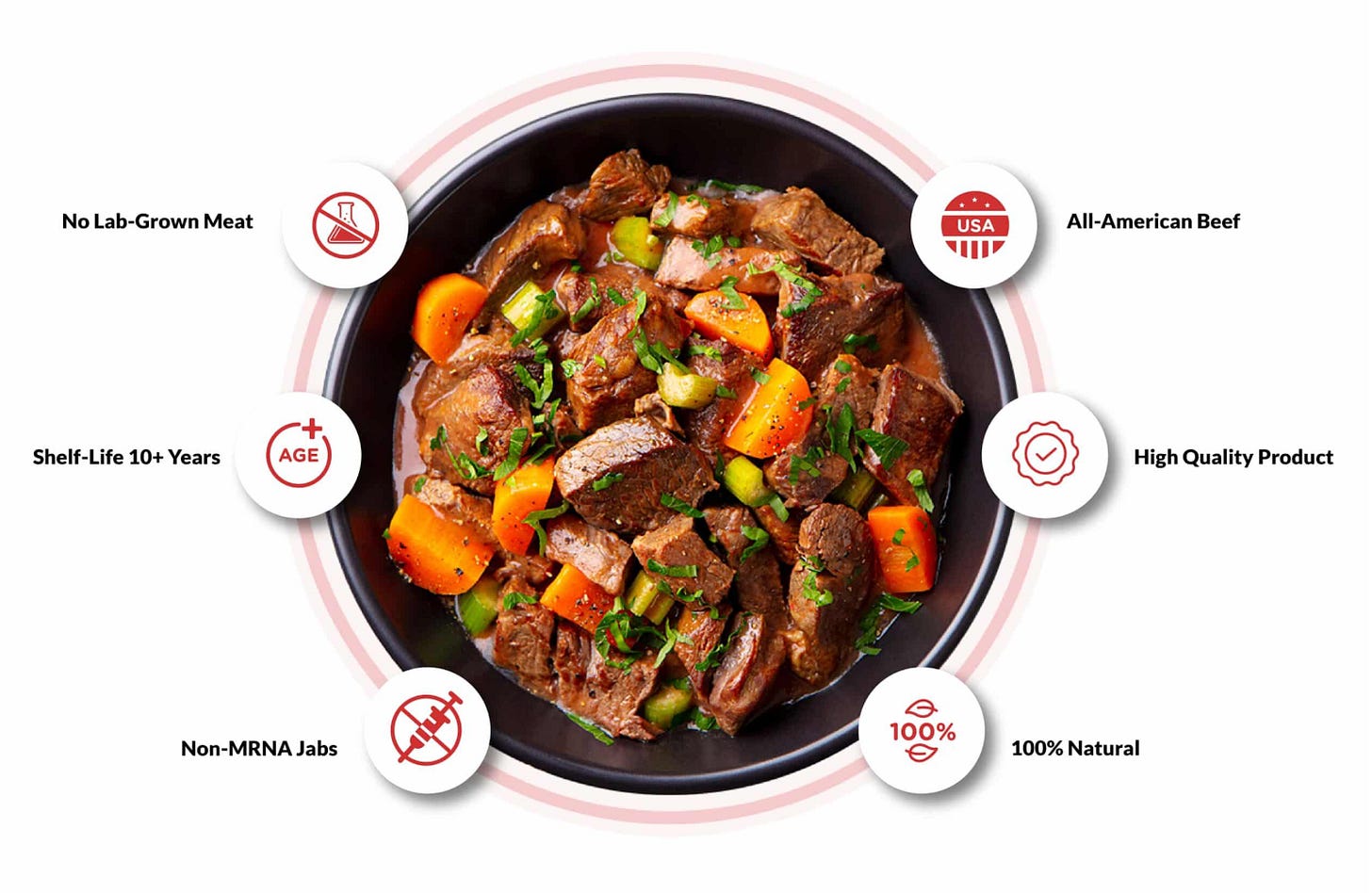 Multiply that by 10 packs, and you’re looking at 120 servings of high-quality American beef you can enjoy today or keep stocked for any emergency.
