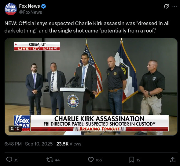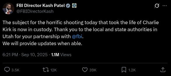 “The subject for the horrific shooting today that took the life of Charlie Kirk is now in custody."