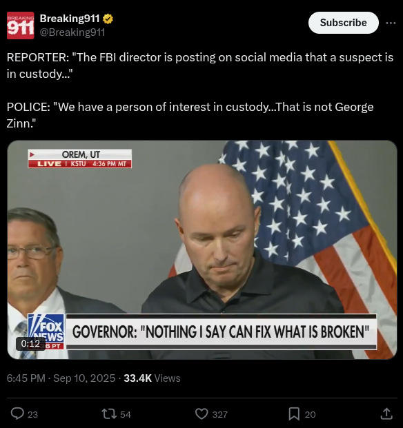 “On September 10, 2025, at 12:20 p.m., a single shot rang out in the quad near the food court on the Utah Valley University Orem Campus as Mr. Charlie Kirk began speaking at his planned rally. We can confirm that Mr. Kirk was shot, but we do not know his condition. The suspect is not in custody. Police are still investigating. The campus is closed for the rest of the day.”