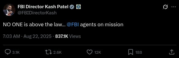 "NO ONE is above the law," FBI Director Kash Patel posted to X Friday morning, but without giving direct reference to the Bolton house raid. "FBI agents on mission."