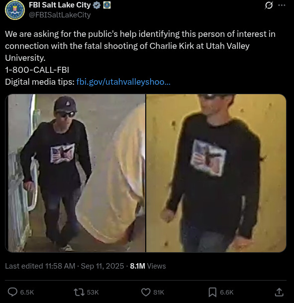 “We are asking for the public’s help identifying this person of interest in connection with the fatal shooting of Charlie Kirk at Utah Valley University,” the bureau’s X post reads.