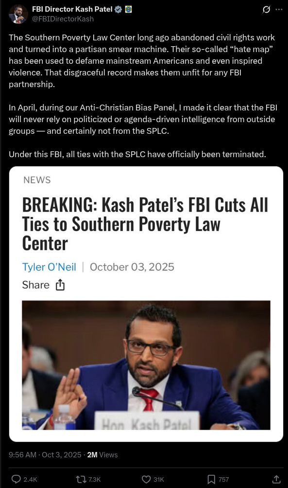 FBI Severs All Ties with SPLC, Patel Slams "Disgraceful Record"