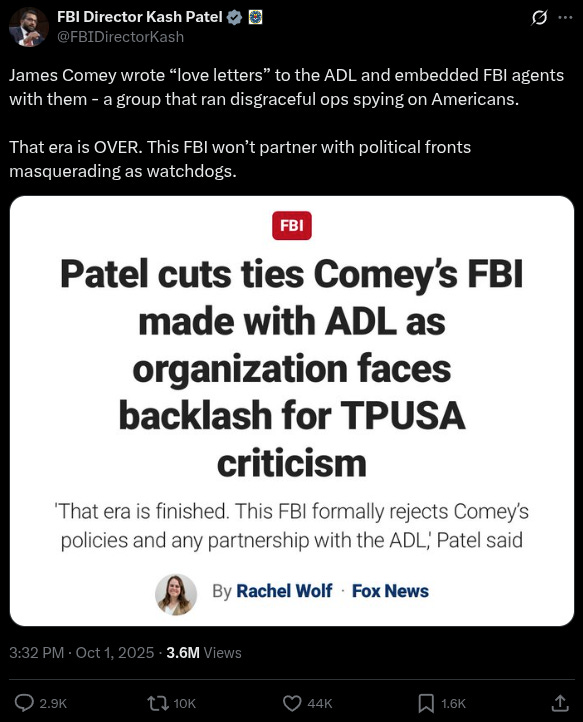 “That era is finished. This FBI formally rejects Comey’s policies and any partnership with the ADL,” Patel continued.