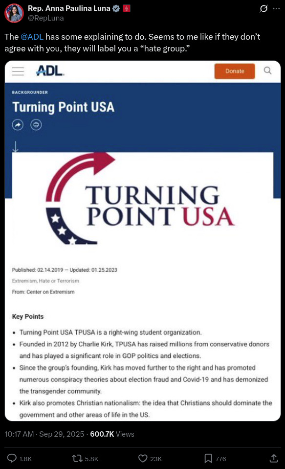 A deleted X post from the ADL in 2019 said TPUSA “is a right-wing student group whose leaders & activists have made multiple racist or bigoted comments & have been linked to a variety of extremists.”