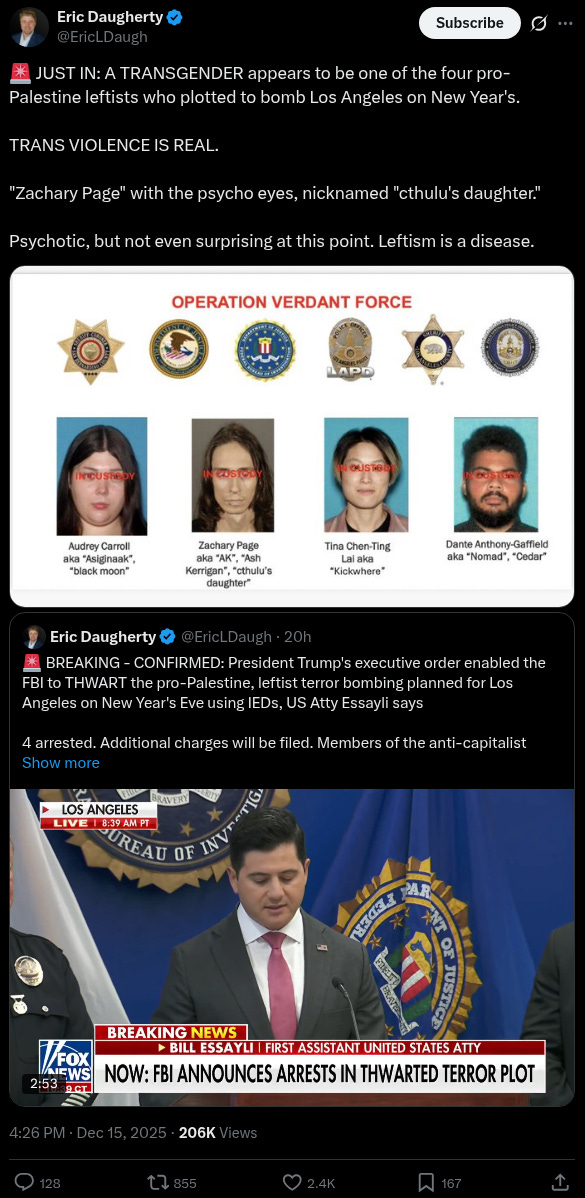 This likely would not have been prevented without President Trump’s directive to refocus federal resources on left-wing threats. Essayli emphasized during a press conference that the investigation ramped up due to the EO, which mobilized the DOJ to target “far-left, pro-Palestine, anti-government and anti-capitalist” networks.