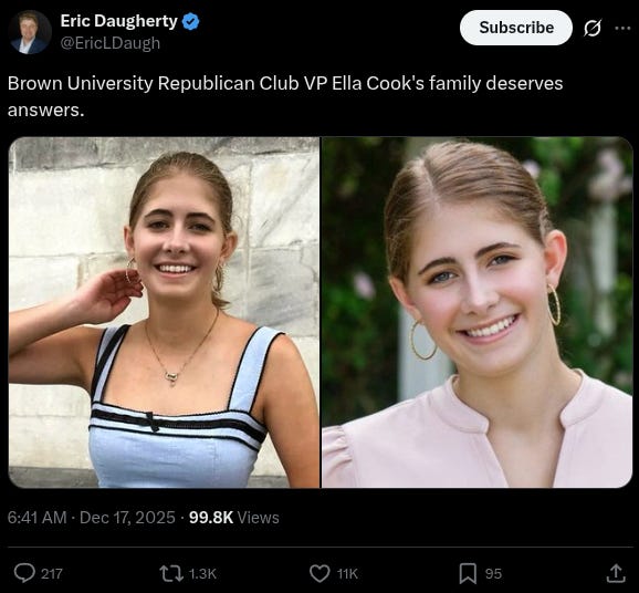 The shooting at Brown occurred Saturday afternoon at the Barus and Holley Engineering Building. Ella Cook and Mukhammad Aziz Umurzokov were both killed. Importantly, Cook served as the vice president of the Ivy League school’s College Republicans.
