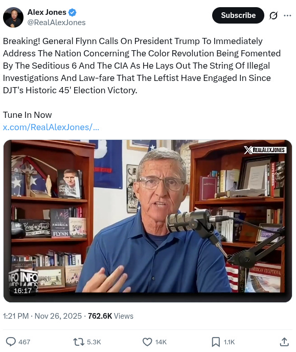 “People need to understand that if this operation succeeds, things will move quickly - Trump would be removed from the scene almost immediately. Elite defection isn’t an early warning sign of an overthrow; it’s the final stage before one,” DataRepublican told us, adding, “This is why the ‘Seditious Six’ must face the most severe penalties the law allows.”