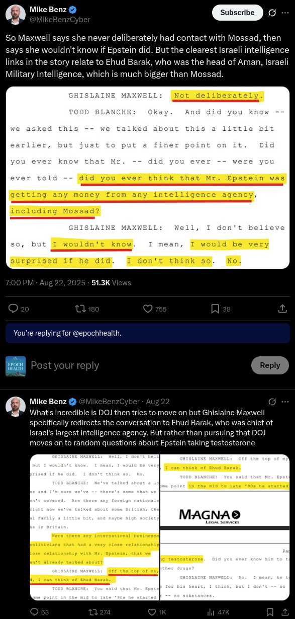She also does not believe Epstein killed himself. She also provided some tricky answers about Mossad...