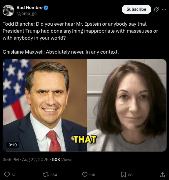"Did you ever hear Mr. Epstein or anybody say that President Trump had done anything inappropriate with masseuses or with anybody in your world?" asked Deputy Attorney General Todd Blanche in Tallahassee, Florida last month.