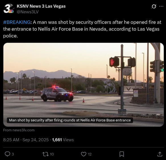 The Las Vegas Metropolitan Police Department reported that an unnamed suspect opened fire outside of the main gate of the Nellis Base and then proceeded to point his gun at security officers at the gate.