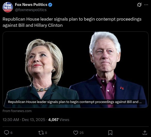 A spokesperson for Comer doubled down to Fox News, confirming direct communication with the Clintons’ attorney: “We communicated to the Clintons’ attorney today that they must appear next week or provide a date in early January to appear for their depositions or we will begin contempt of Congress proceedings. They’ve been dragging their feet for over four months. Time’s up.”