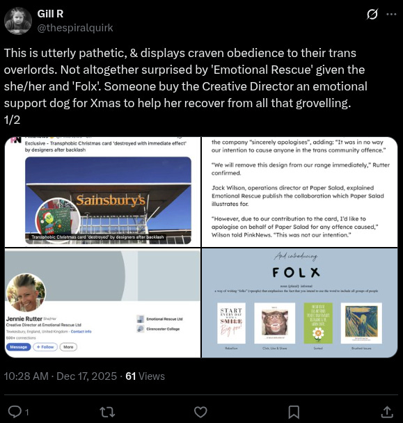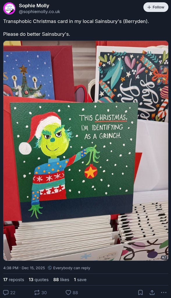 Sophie Molly, a transgender ‘journalist,’ whinged on BlueCry after spotting the card at a branch of the supermarket in Aberdeen. Sharing a photo of the horrendously offensive item, she wrote: “Transphobic Christmas card in my local Sainsbury’s (Berryden). Please do better Sainsbury’s.”