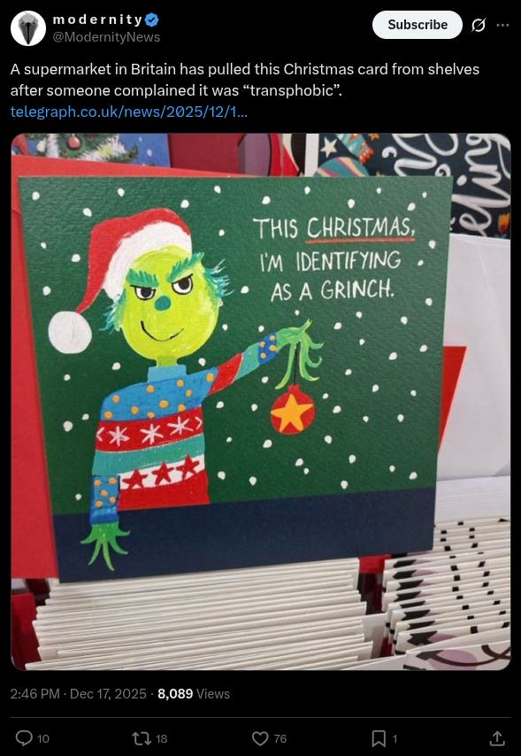 In this festive fiasco, the real Grinches are the ones stealing joy from Christmas, demanding conformity while crushing free expression. The card’s removal isn’t about protecting anyone—it’s about enforcing ideological obedience, where even a cartoon character can’t escape the wrath of the trans mob.