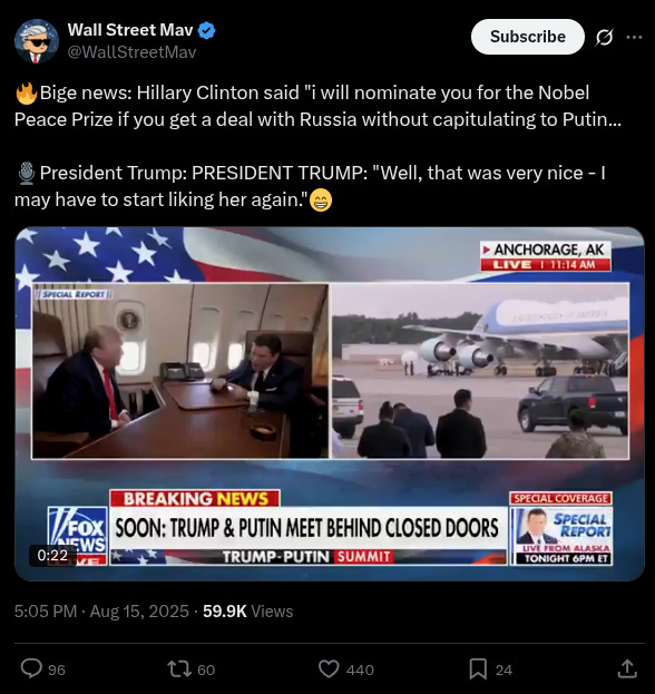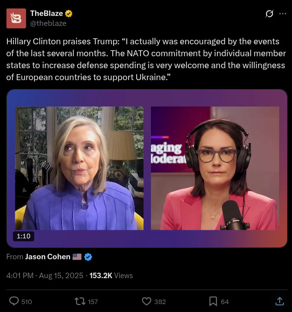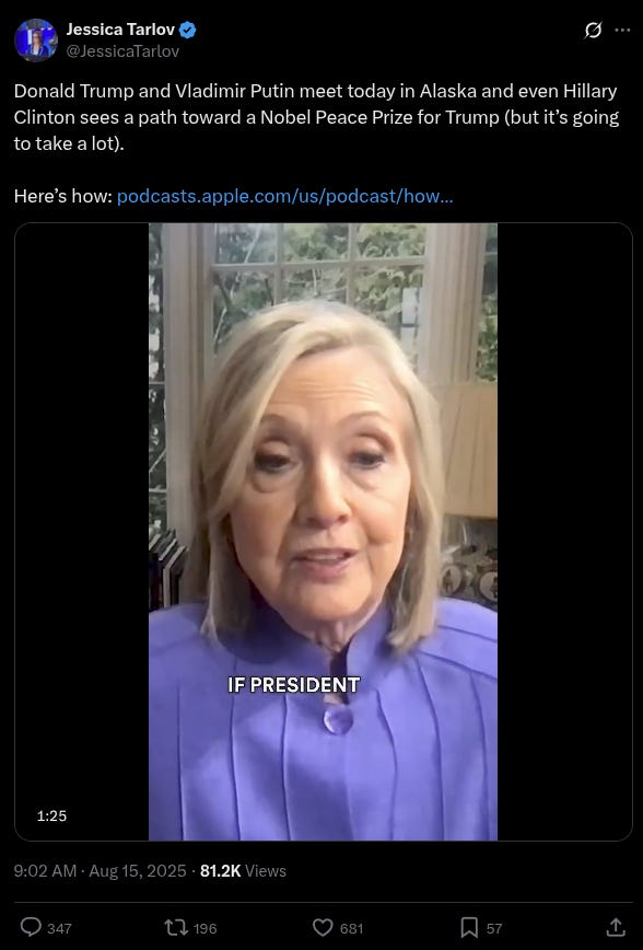 Elsewhere during the podcast, Hillary commented on Trump’s meeting with Vladimir Putin scheduled for today, noting “Honestly, if he could bring about the end to this terrible war, if he could end it without putting Ukraine in a position where it had to concede its territory to the aggressor, could really stand up to Putin — something we haven’t seen, but maybe this is the opportunity — if President Trump were the architect of that, I’d nominate him for a Nobel Peace Prize.”