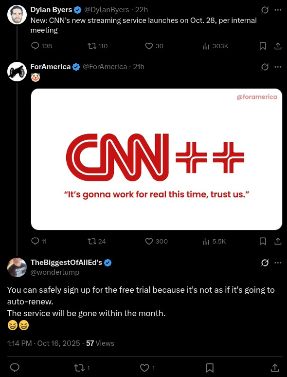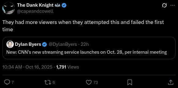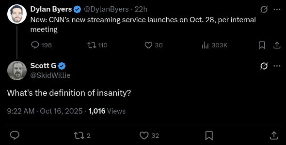 With cable TV revenues cratering and audiences fleeing to ad-supported platforms like YouTube or X for their fixes of real news, CNN’s second attempt smacks of pure desperation rather than innovation.