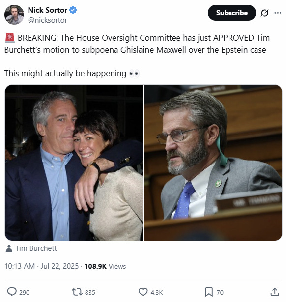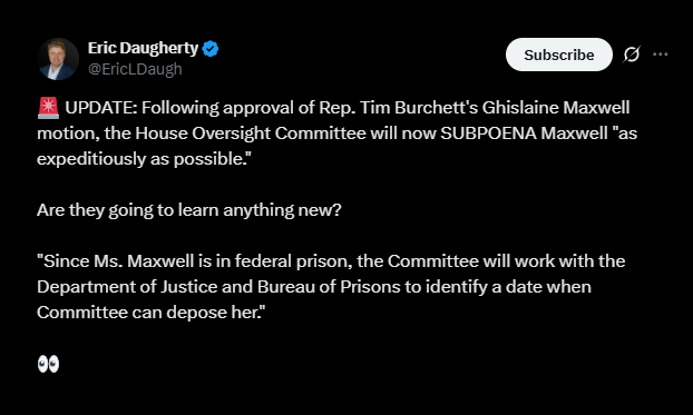 “’Recently, Rep. Burchett sent a letter to Chairman Comer requesting a subpoena for Ghislaine Maxwell’s testimony. In response, Chairman Comer directed Rep. Burchett to introduce a motion to subpoena Ms. Maxwell for a deposition, allowing the Committee to formally consider whether to proceed’, a spokesperson for the committee said in a statement.