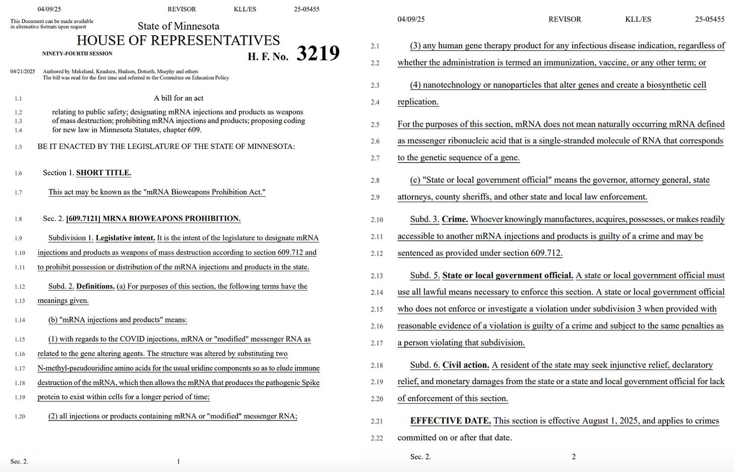 It also aligns with Minnesota Bill HF3219, which classifies mRNA injections and related products as weapons of mass destruction under Section 609.712, prohibiting their possession or distribution within the state.