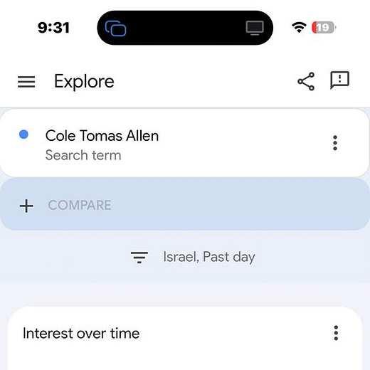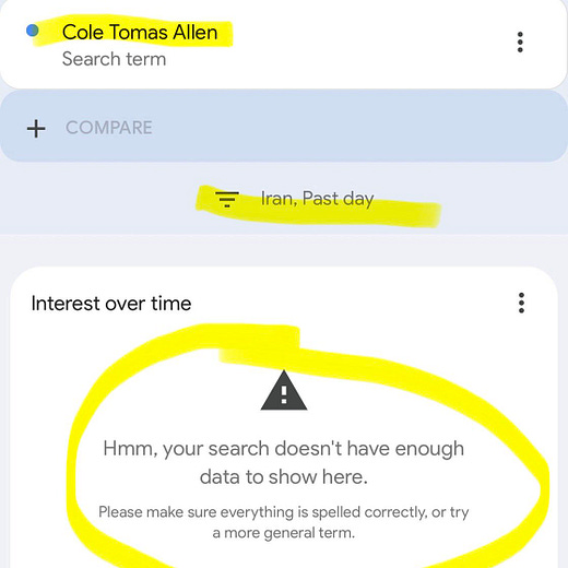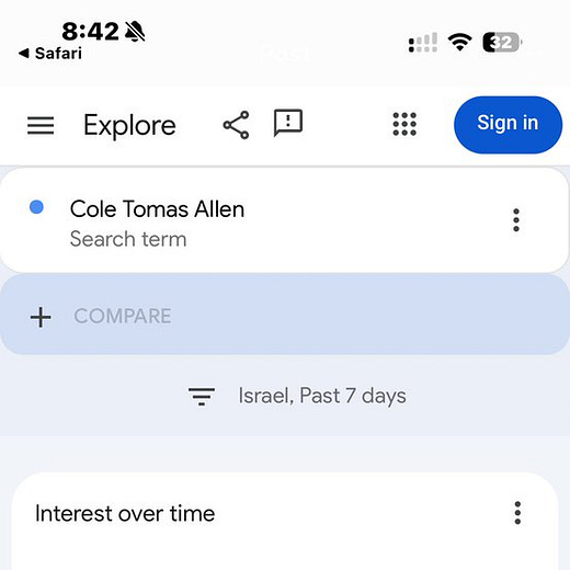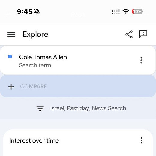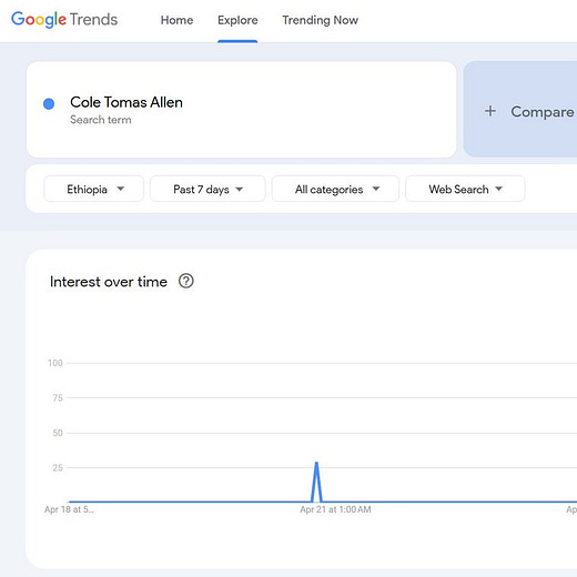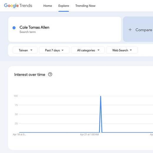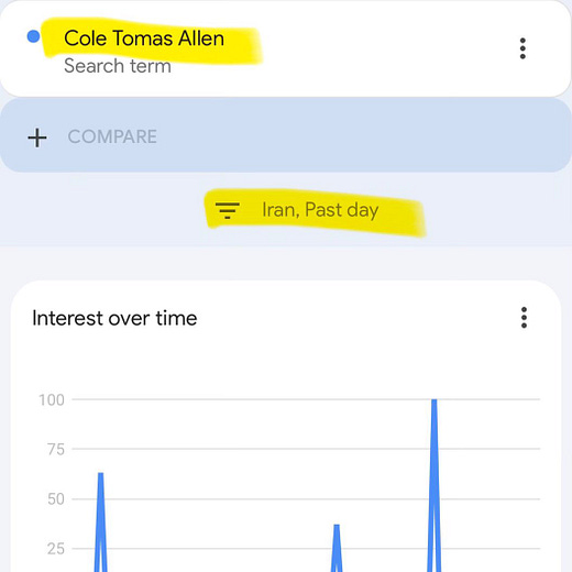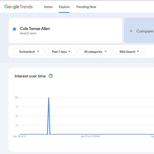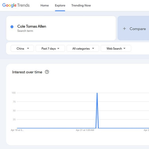 Internet sleuths took screenshots of Google search trends reportedly showing people across the world specifically searching for “Cole Tomas Allen” days before the shooting took place.