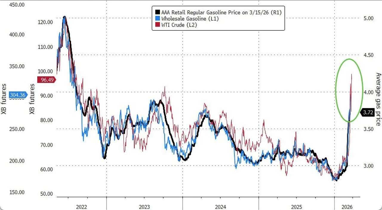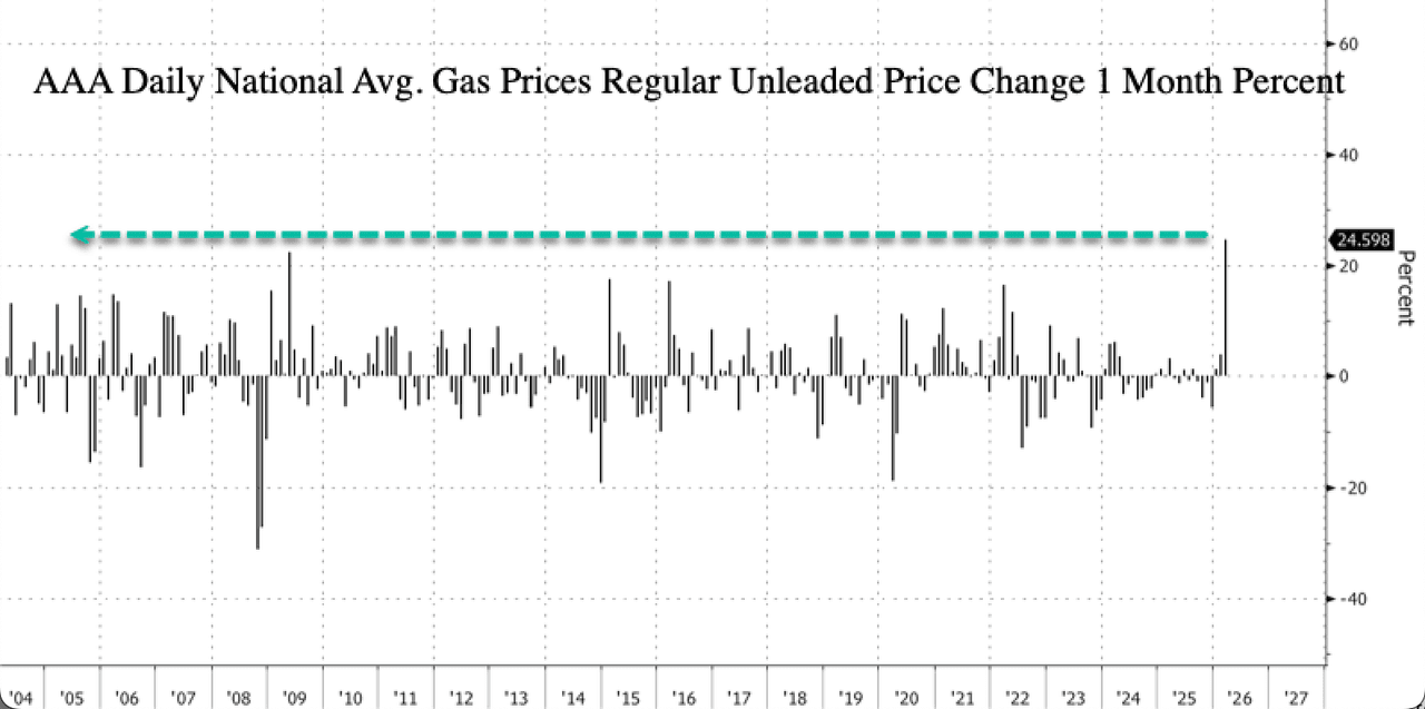 In the US, the effects of an energy shock from the Middle East, according to new AAA data, show regular gas at the pump has jumped the most for any single month on record, up 25% so far in March.