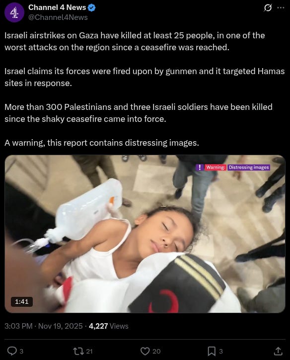 The Israeli escalation came two days after the UN Security Council passed a resolution affirming President Trump’s so-called “ceasefire deal” that places the Gaza Strip under the control of the US-led board. Since the ceasefire was supposed to go into effect on October 10, the Trump administration has backed Israel’s continued attacks on Palestinians.