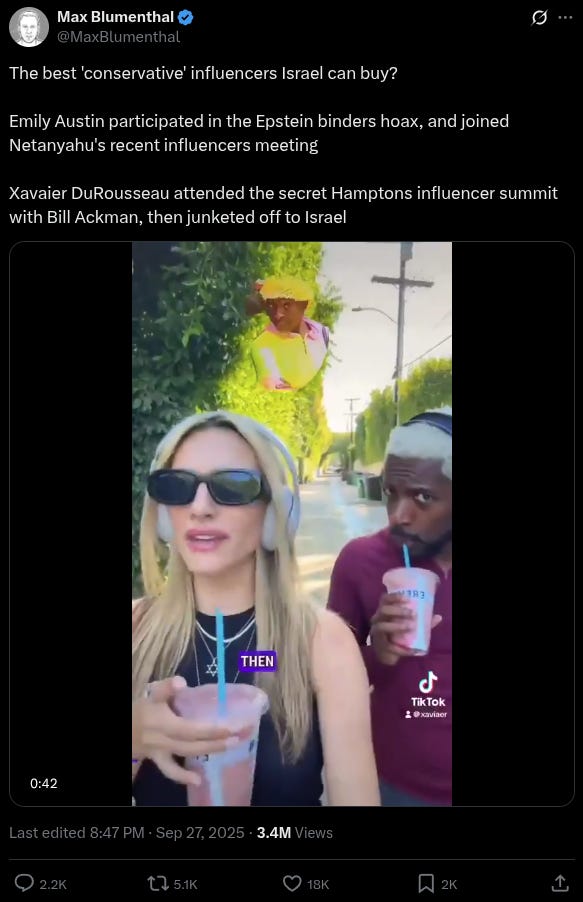 Following Israeli Prime Minister Benjamin Netanyahu’s meeting in New York on Friday with a group of pro-Israel influencers, we learn that Israel is likely paying them a whopping $7,000 per pro-Israel social-media post in a desperate drive to bolster plummeting support of Israel among America’s young conservatives.