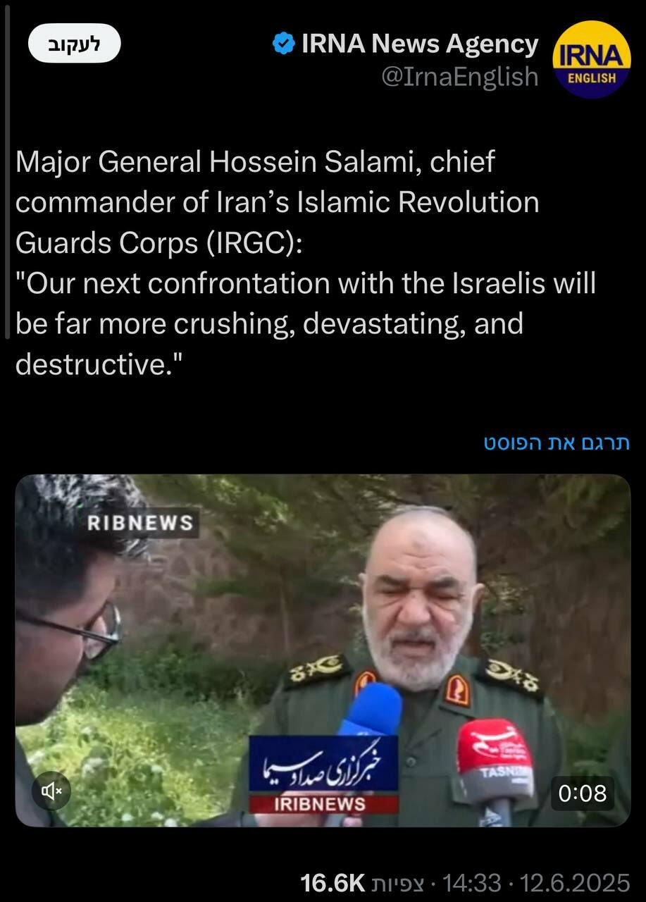 Al Jazeera: "Iran’s Tasnim news agency and Tehran Times newspaper say Hossein Salami, commander-in-chief of the Islamic Revolutionary Guard Corps, has been killed in an Israeli strike."