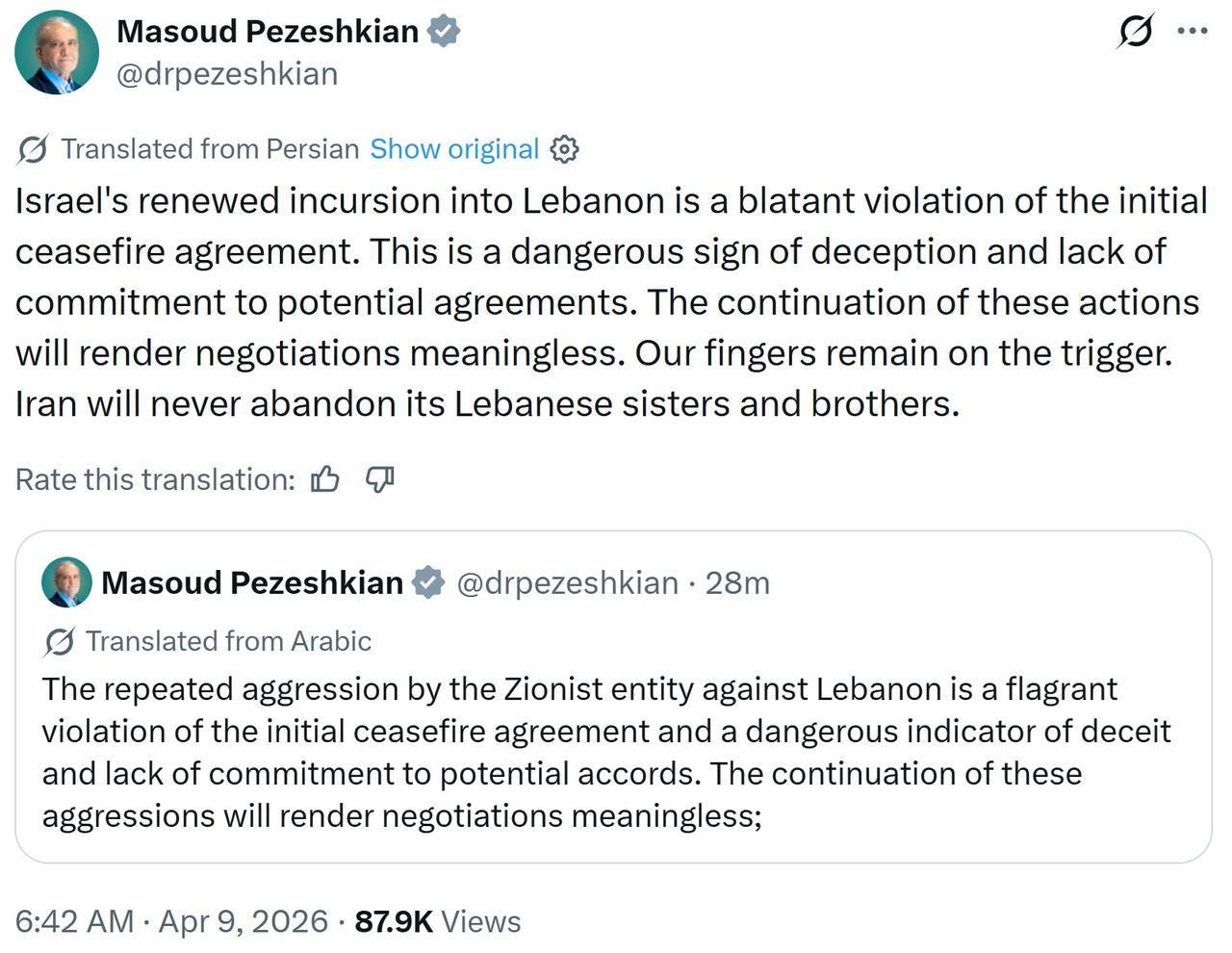 Iranian lawmaker Ibrahim Azizi stated: “Once again, you have proven that you do not know the meaning of a ceasefire” and “Only fire will discipline you...so wait for it”.