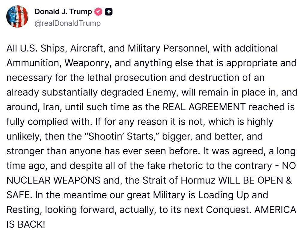US President Donald Trump posted: “All U.S. Ships, Aircraft, and Military Personnel....will remain in place in, and around, Iran, until such time as the REAL AGREEMENT reached is fully complied with”.