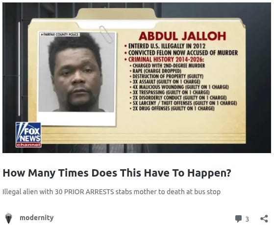 In addition, last week a Sierra Leone illegal with 30 prior arrests—including rape— stabbed a Virginia mother to death at a bus stop.
