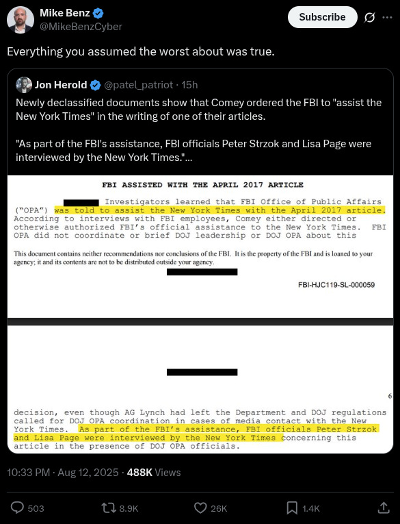 Author and podcaster Jon Herold wrote on 𝕏, “Newly declassified documents show that Comey ordered the FBI to ‘assist the New York Times’ in the writing of one of their articles. ‘As part of the FBI’s assistance, FBI officials Peter Strzok and Lisa Page were interviewed by the New York Times.'”