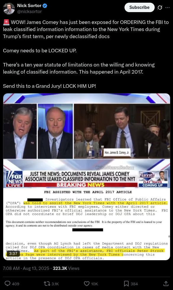 He also noted the statute of limitations for sharing classified information is typically five years, but that it’s extended to ten years if the culprit did so “willing and knowing,” which clearly describes Comey’s actions.