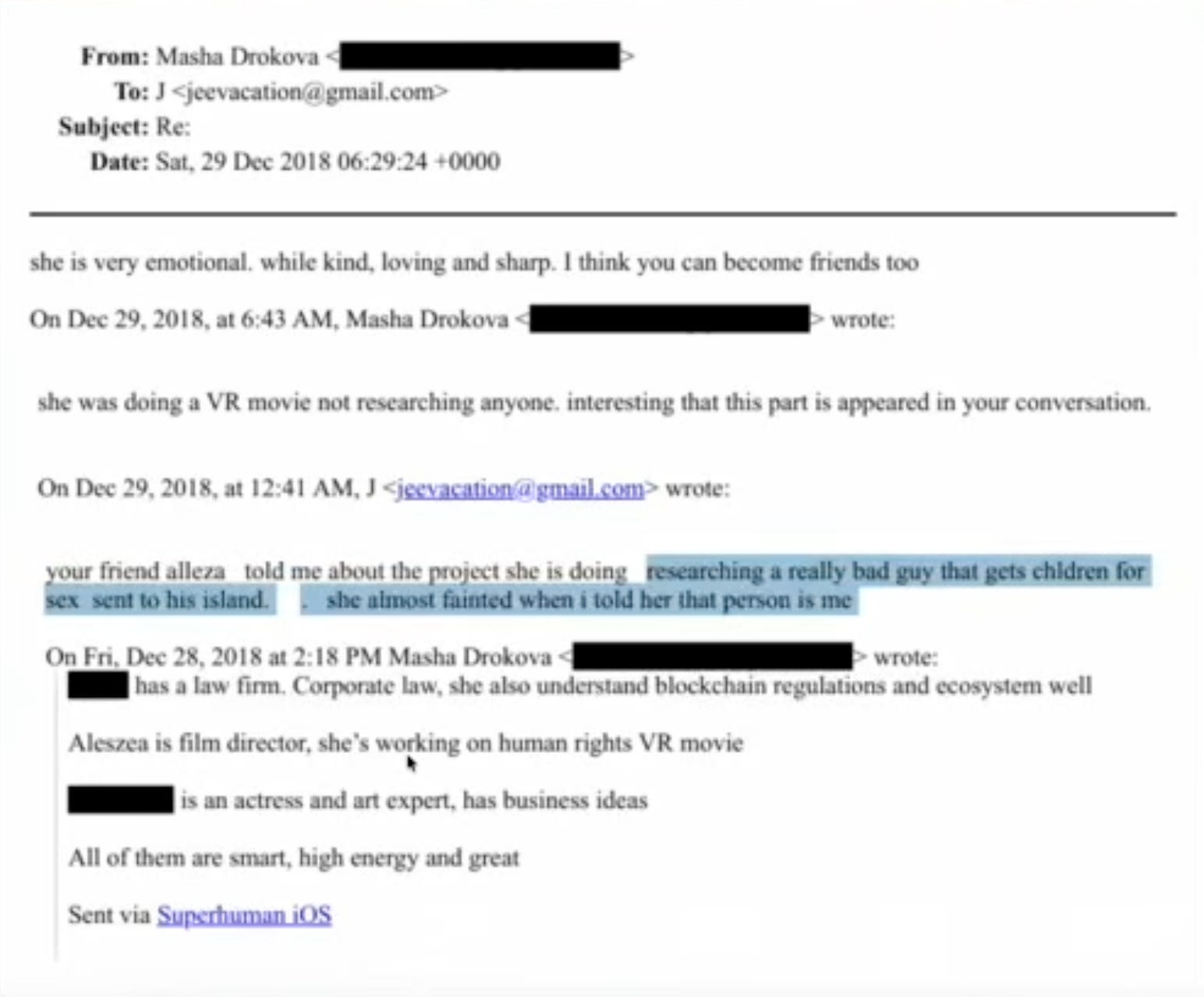 “your friend alleza told me about the project she is doing researching a really bad guy that gets children for sex sent to his island. she almost fainted when i told her that person is me”
