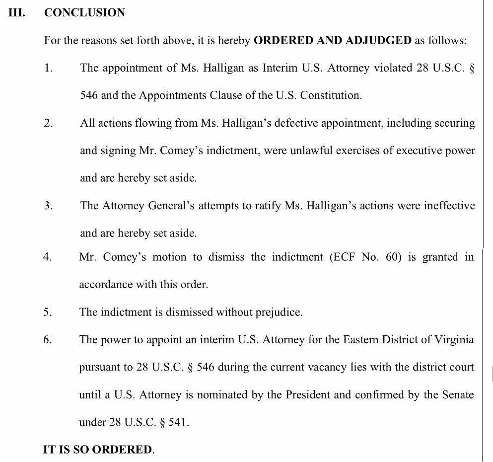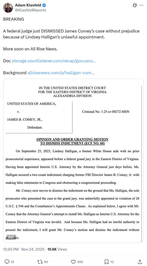 A federal judge has dismissed cases against former FBI Director James Comey and NY Attorney General Letitia James, after finding that US Attorney Lindsey Halligan was unlawfully appointed to the role, and that AG Pam Bondi cannot ratify her actions.
