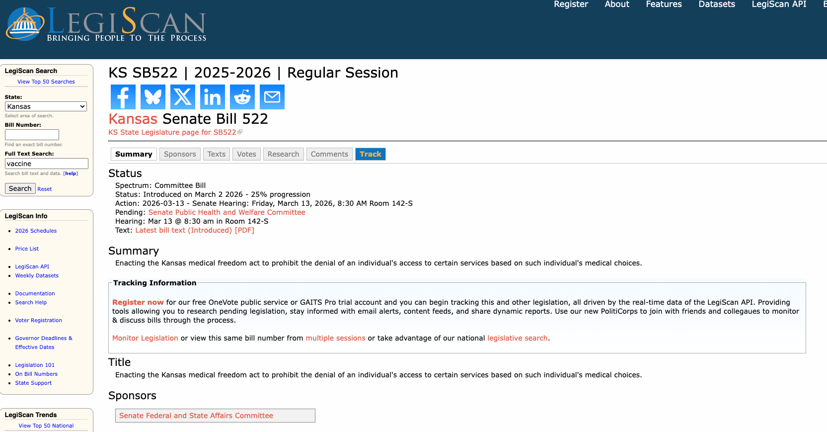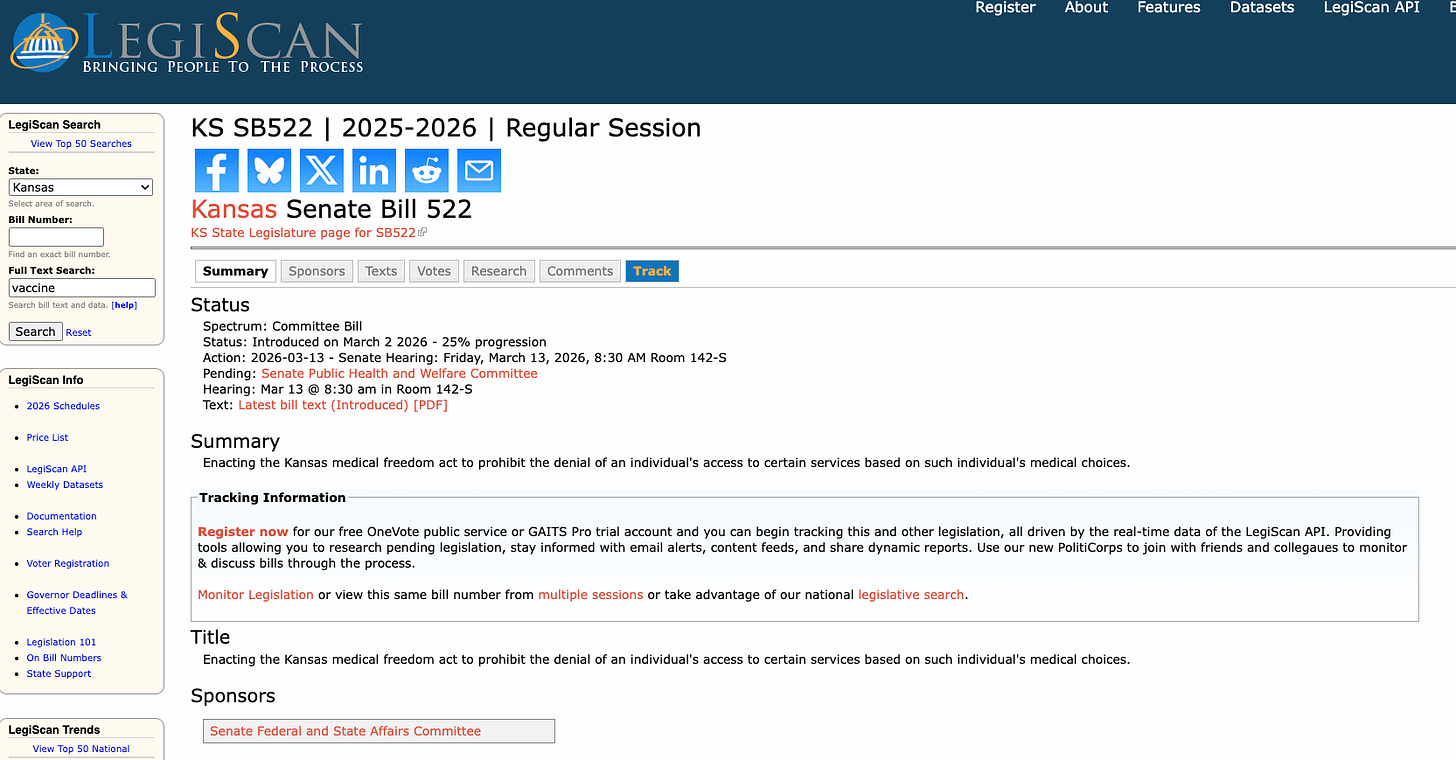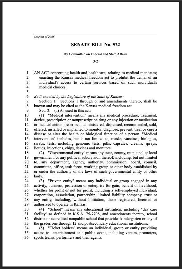 SB522 would establish the “Kansas Medical Freedom Act,” prohibiting both government and private entities from denying services, employment, access to events, or public benefits based on whether an individual accepts or refuses a medical intervention.