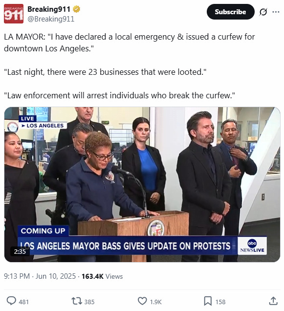 In a bizarre twist, after spending much of the past week pleading just how peaceful the LA riots hugfest has been, and slamming Trump for deploying the national guard to the city after the local police was ordered to stand down, moments ago LA mayor Karen Bass announced that a curfew will be put into effect for one square mile of downtown Los Angeles following four nights of violent, chaotic protests and looting, during which the LAPD arrested more than 150 people.