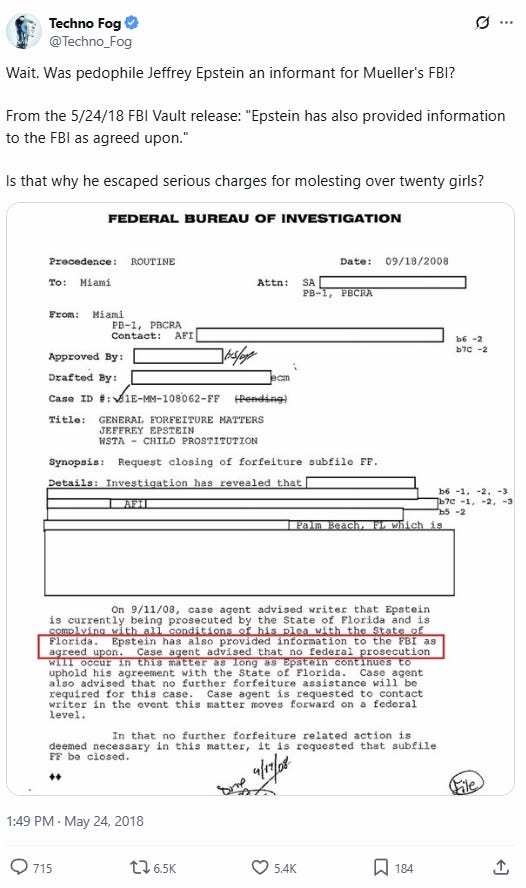 In 2018, The Gateway Pundit reported that Jeffrey Epstein was not just protected by federal authorities but may have actively worked as an informant for the FBI under former Director Robert Mueller.