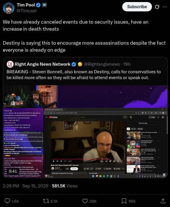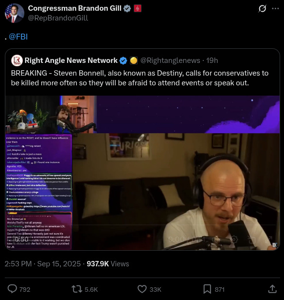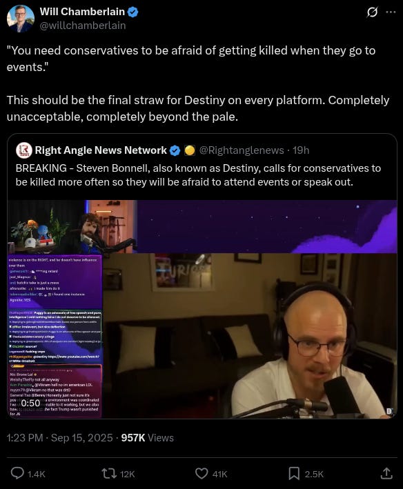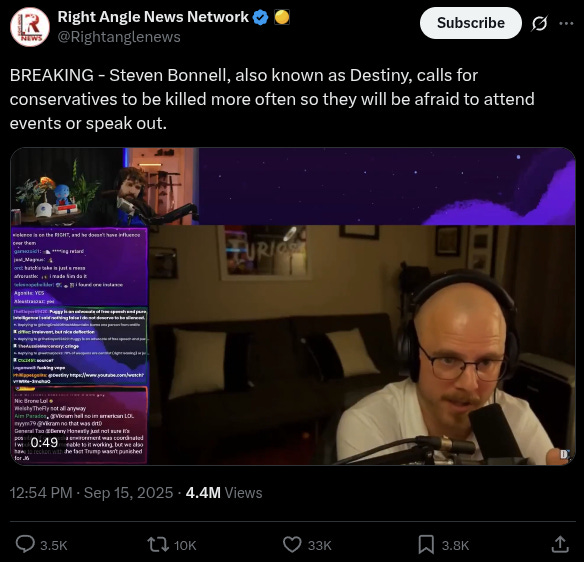 Left-wing streamer Steve Bonnell, AKA “Destiny” called for conservatives to be killed more often so they will be afraid to attend events or speak out.
