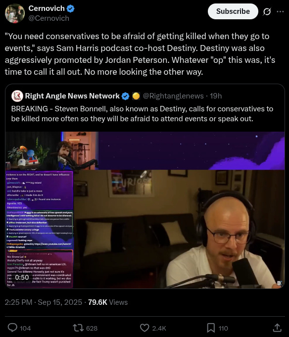 You can go deeper than this. Destiny described once how he was planning to murder a conservative and only decided against it because of the money he was making from streaming.