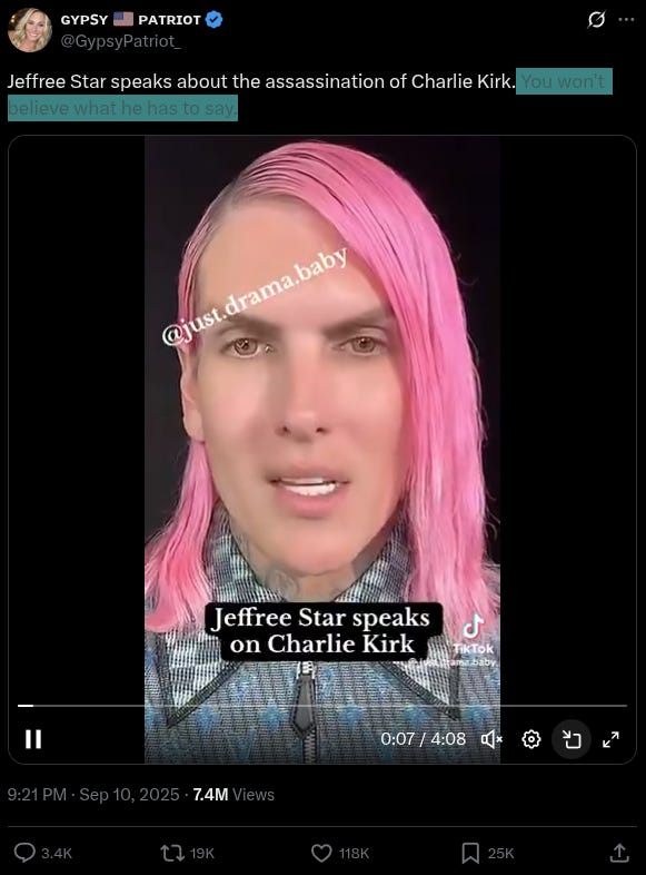 Makeup mogul and LGBT icon Jeffree Star unleashed a fiery tirade against the transgender movement during a TikTok live stream while paying tribute to conservative powerhouse Charlie Kirk, who was tragically assassinated during a debate at Utah Valley University.