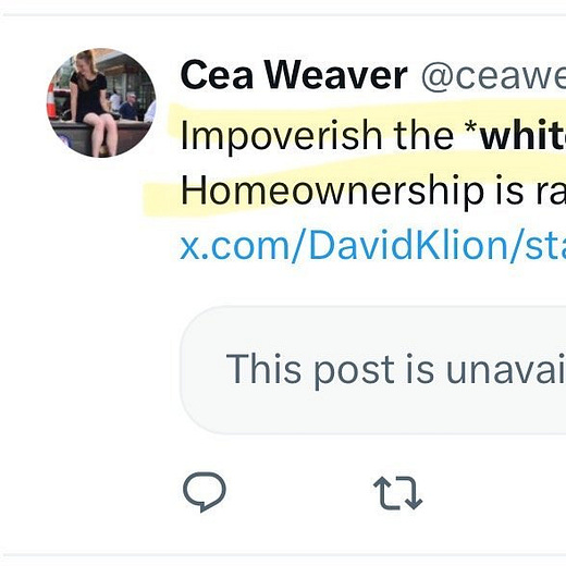 In another 2018 post, Weaver wrote that “home ownership is racist / failed public policy” and demanded politicians “impoverish the *white* middle class,” says The Telegraph. Weaver appears to be white herself. I suppose she’s angling to be “one of the good ones” in the eyes of her fellow Democratic Socialists of America (DSA) members.