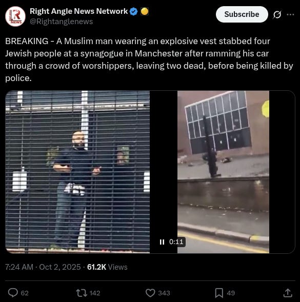 A horrific vehicle-ramming and stabbing attack occurred earlier today at the Heaton Park Hebrew Congregation Synagogue, located in a suburb of Manchester, Greater Manchester, England. The incident took place during Yom Kippur, the holiest day in Judaism.
